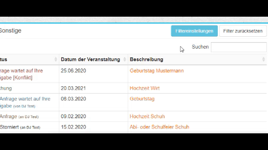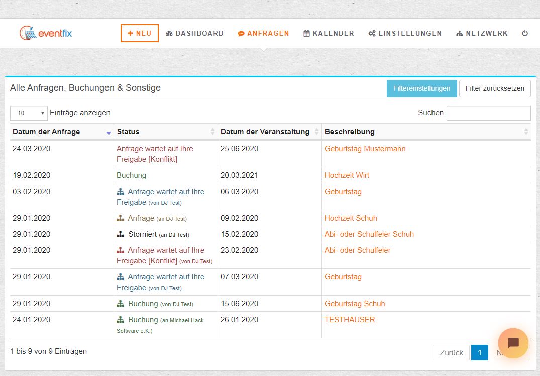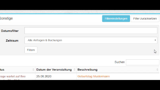 Unter dem Menüpunkt "Anfragen" siehst Du alle Anfragen und Buchungen auf einen Blick. Du kannst Dir pro Seite zwischen 10 und 100 Events anzeigen lassen.