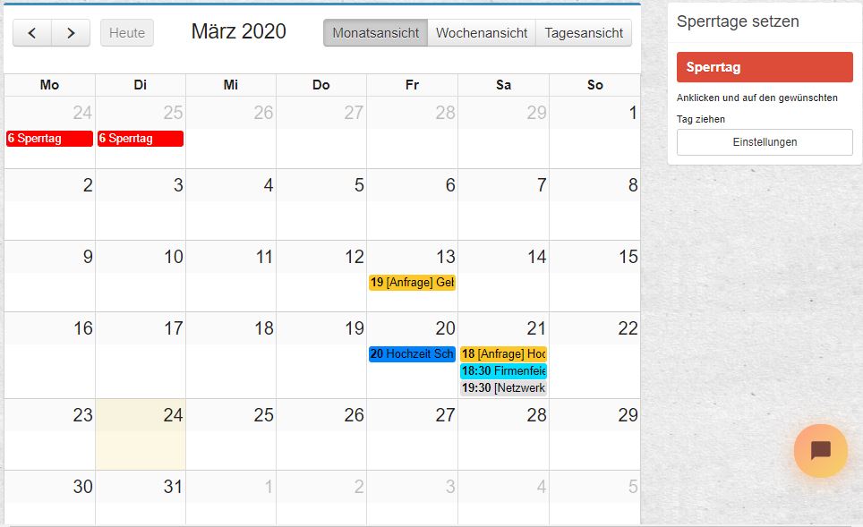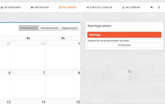 Im Kalender siehst Du alle Aktionen wie z.B. Anfragen, Buchungen etc. auf einen Blick. Du kannst auswählen zwischen: